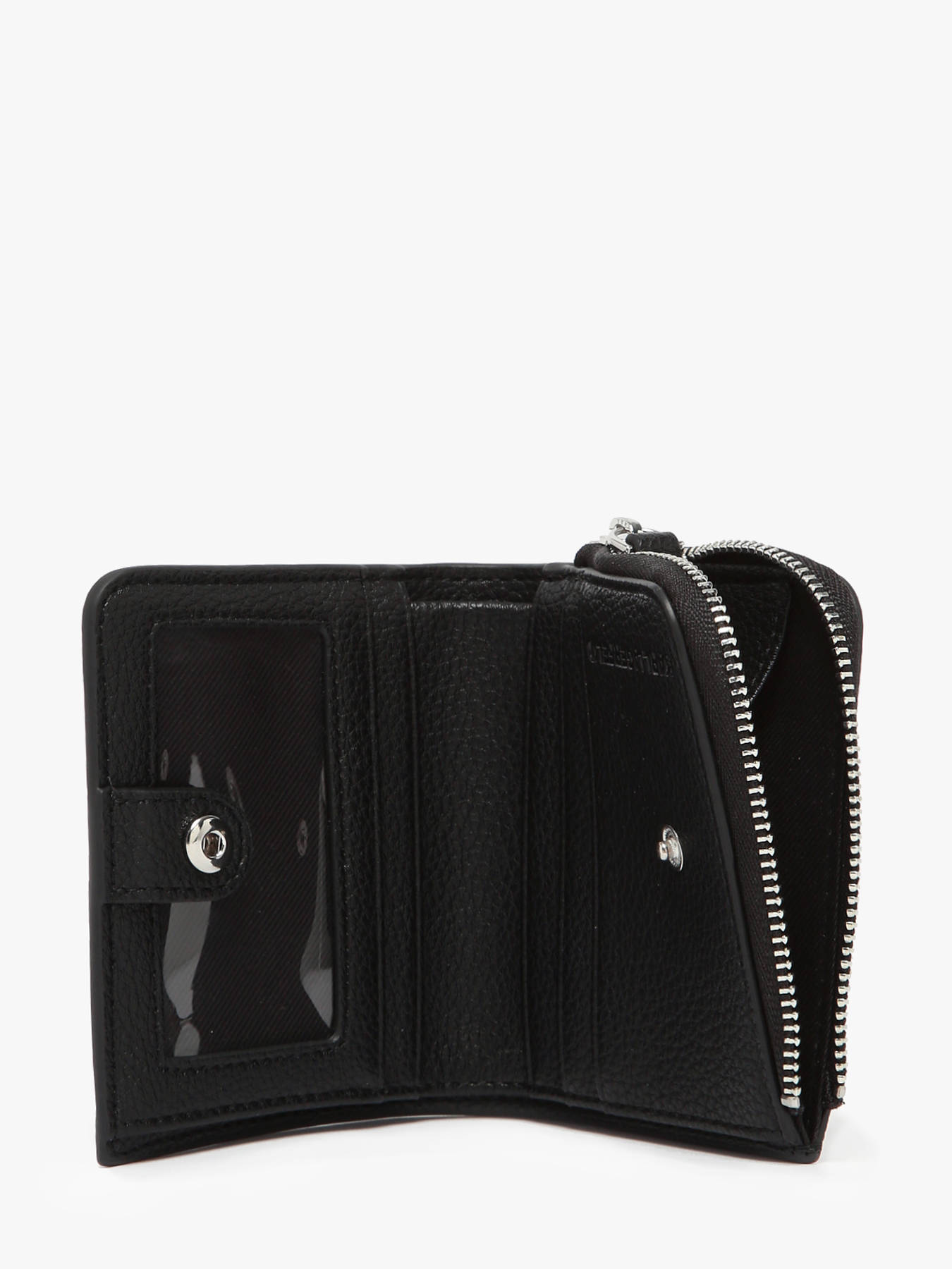 Portefeuille KARL LAGERFELD van gerecycled polyurethaan, dat ecologische betrokkenheid en functioneel design combineert. De buitenkant heeft twee hoofdvakken en sluit met een dubbel systeem van ritssluiting en drukknop, wat optimale veiligheid voor uw persoonlijke bezittingen garandeert. Binnenin biedt het vier vakken voor bankpassen, een vak voor biljetten en een transparant vak ideaal voor een identiteitskaart of badge. Deze compacte portemonnee combineert praktisch gebruiksgemak, organisatie en een moderne stijl, perfect voor een efficiënte beheer van uw essentials in het dagelijks leven.