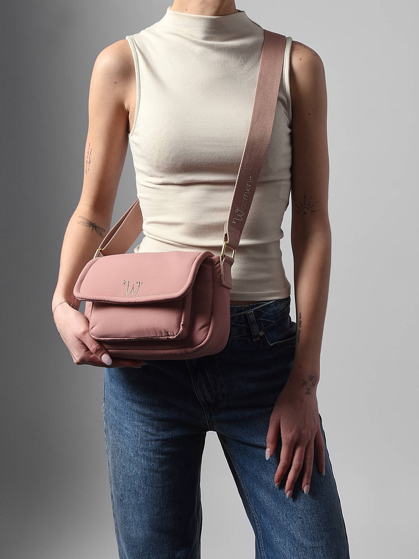 De cross body tas WOOMEN uit de PRIMEVERE-lijn, in klein formaat, charmeert met zijn magnetische overslag, veilige ritssluiting en praktische vakken. Hij heeft een ritsvak aan de voor- en achterkant. Gemaakt van gerecycled nylon, is hij uitgerust met een verstelbare schouderriem voor een comfortabele crossbody draagwijze. De binnenzijde, gevoerd met katoen en linnen, bevat een hoofdvak, twee insteekvakken en een ritsvak. Het gouden W-logo in hars en de sierkoordjes geven dit verfijnde en verantwoorde accessoire een elegante afwerking.