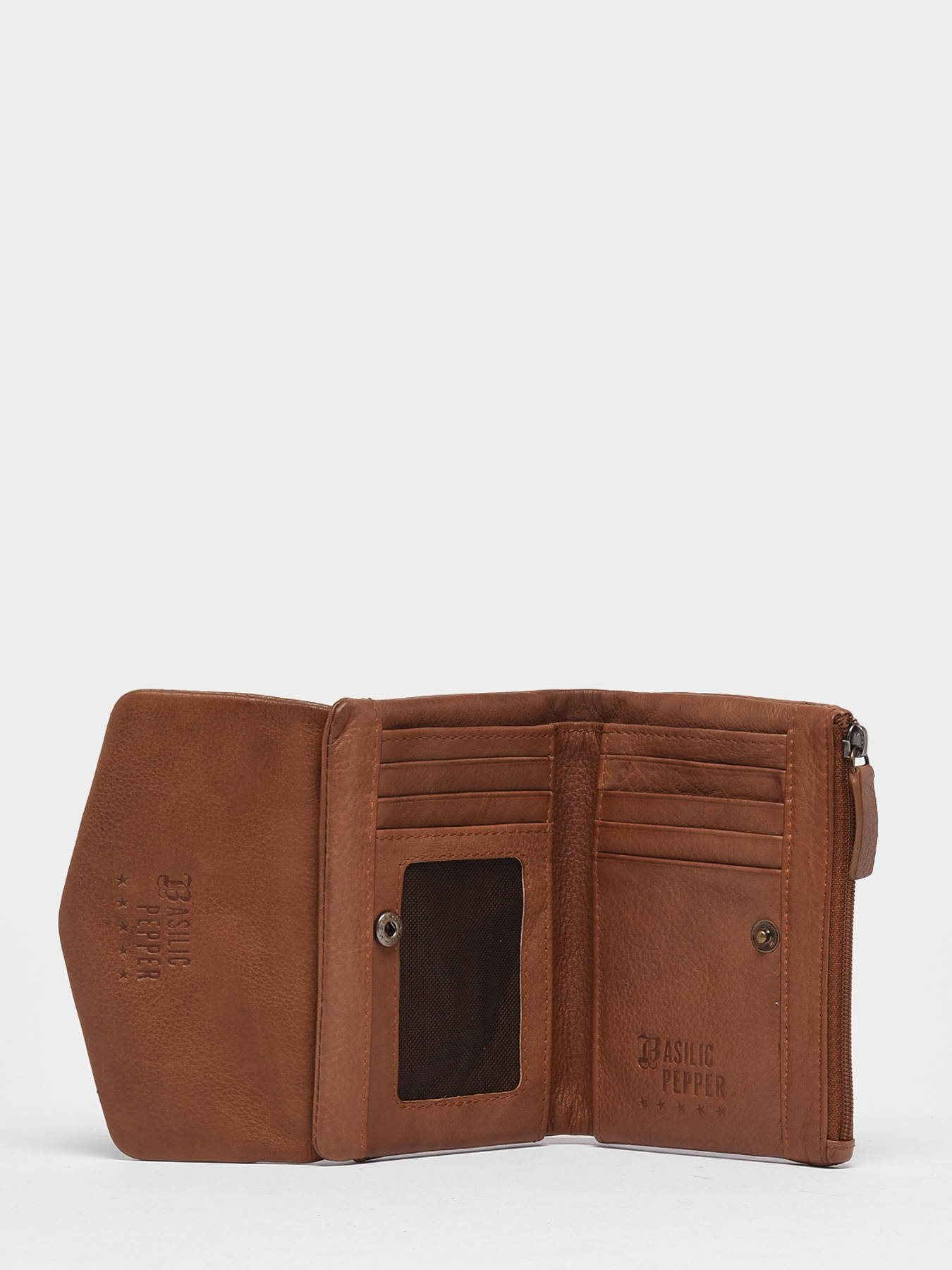 Een compacte en uiterst praktische portemonnee, uit de Smart collectie van Basilic Pepper. Deze mooie portemonnee uit soepel rundsleder heeft een vintage uitstraling, en is handig ingedeeld. Zo zijn er twee compartimenten voorzien: het compartiment vooraan sluit met behulp van een drukknopje, en beschikt over zes open steekvakjes voor kaarten. Achteraan is een ritsvak voorzien, om cash en muntstukken in op te bergen.