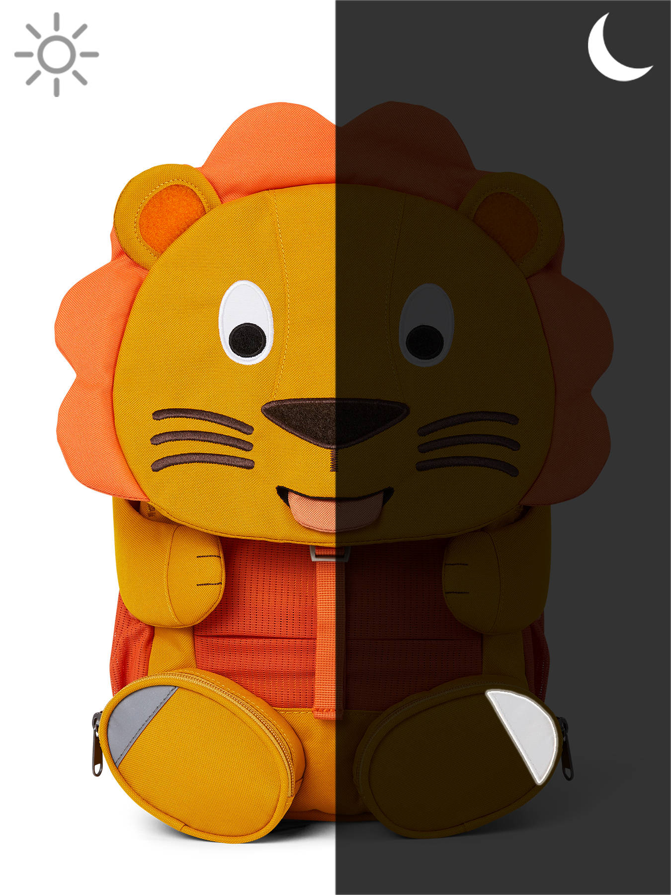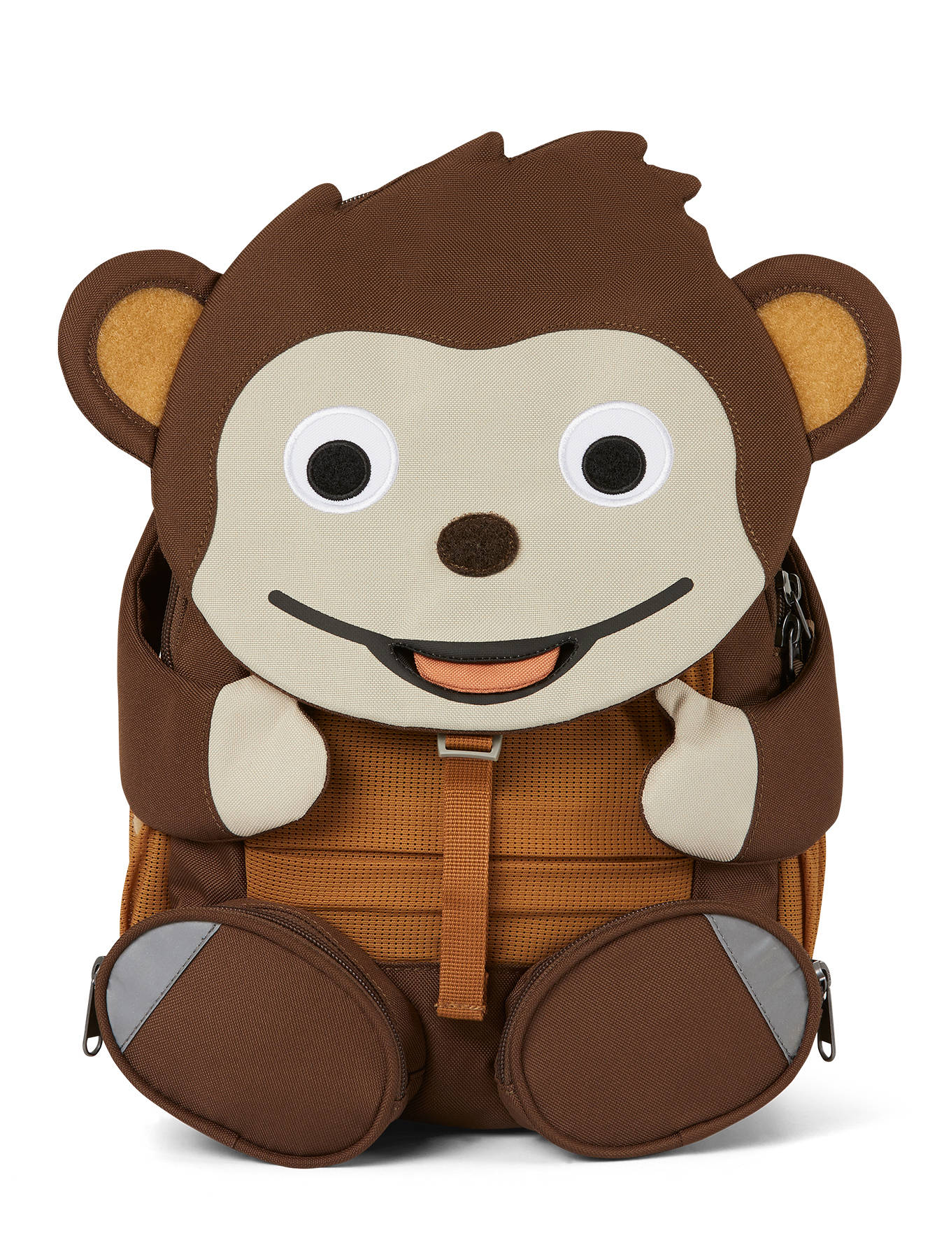 Maak kennis met dit toffe rugzakje van het Duitse merk Affenzahn, de nieuwe beste vriend van uw kleuter! De rugzak is gemaakt uit stevig en waterafstotend materiaal, en heeft tal van voordelen! De pootjes van het diertje hebben een velctro patch, die aan de neus, ogen en oortjes kunnen bevestigd worden. Laten we verstoppertje spelen! Ook de tong is uitrekbaar, en onthult een handig naamlabel. Het hoofdcompartiment van dit rugzakje sluit met rits, en kan makkelijk een schriftje of lunchbox bevatten. Vooraan en aan weerszijden zijn extra vakjes uit mesh voorzien, om kleine spulletjes in te stoppen. Ook de pootjes onthullen twee kleine ritsvakjes! De verstelbare schouderbandjes en rugzijde zijn gewatteerd, voor optimaal draagcomfort. De rugzak is ook voorzien van reflectoren, zodat uw kleuter zich veilig in het verkeer kan begeven. Ook perfect als lunchtas!