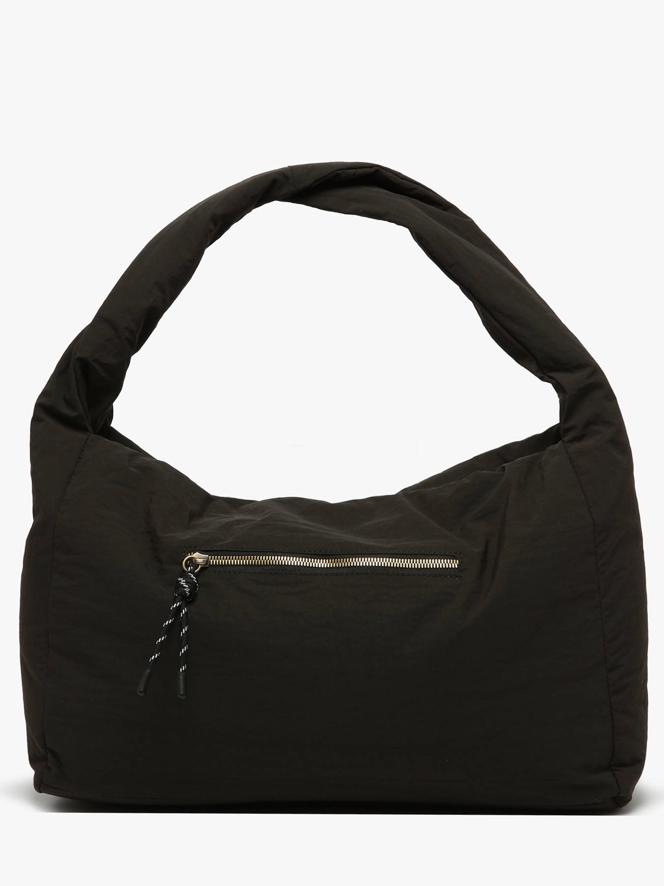 De WOOMEN schoudertas uit de PRIMEVERE-lijn, praktisch van groot formaat, valt op door zijn elegante gedraaide hengsel, sierkoordjes en het gouden W-logo van hars. Gemaakt van gerecycled nylon, beschikt hij over een ritssluiting, een achtervak en een binnenkant gevoerd met katoen en linnen met twee eenvoudige vakken, een ritsvak en een hoofdvak.