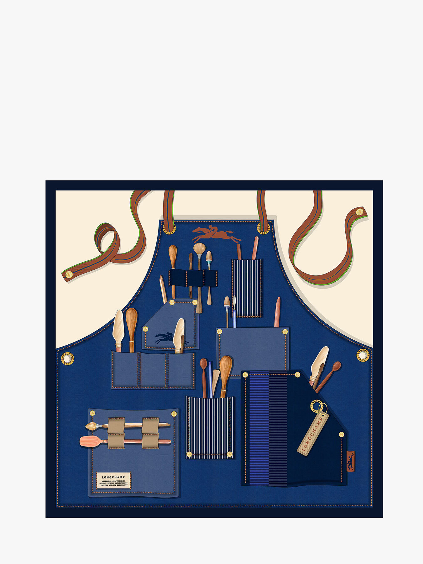 Deze zijden carré Longchamp Worker (50 x 50 cm) is een ode aan het Parijse ambachtelijke vakmanschap, met een motief dat doet denken aan het schort van de ambachtsman. De zorgvuldig geïllustreerde zakken en gereedschappen roepen het atelier op, het gebaar, het materiaal, en vieren de schoonheid van handwerk. De delicate zijden stof en verfijnde afwerking maken dit accessoire zowel poëtisch als functioneel. Rond de hals, in het haar of aan het handvat van een tas geknoopt, geeft deze sjaal elke outfit een creatieve en elegante uitstraling.